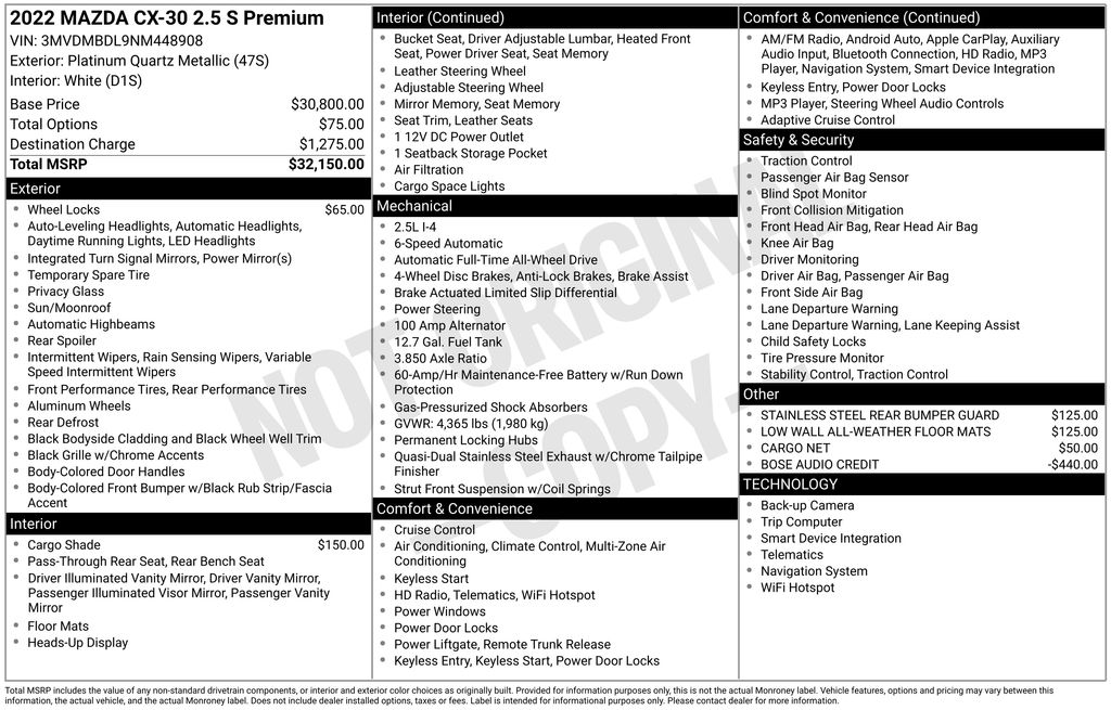 Platinum Quartz Metallic 2022 Mazda CX-30 2.5 S Premium Package AWD 6-Speed Automatic SKYACTIV® 2.5L 4-Cylinder DOHC 16V CLEAN CARFAX, CARFAX ONE OWNER, INCLUDES WARRANTY, BLUETOOTH, BLIND-SPOT MONITOR, BACK-UP CAMERA, LEATHER SEATS, HEATED SEATS, PREMIUM WHEELS, REMOTE START, ADAPTIVE CRUISE CONTROL.